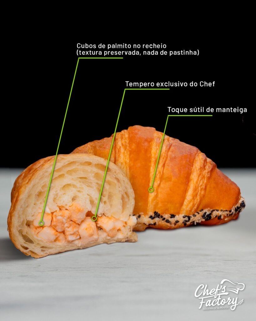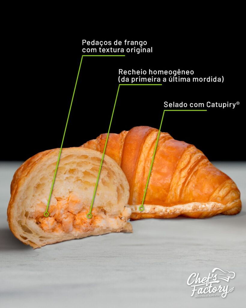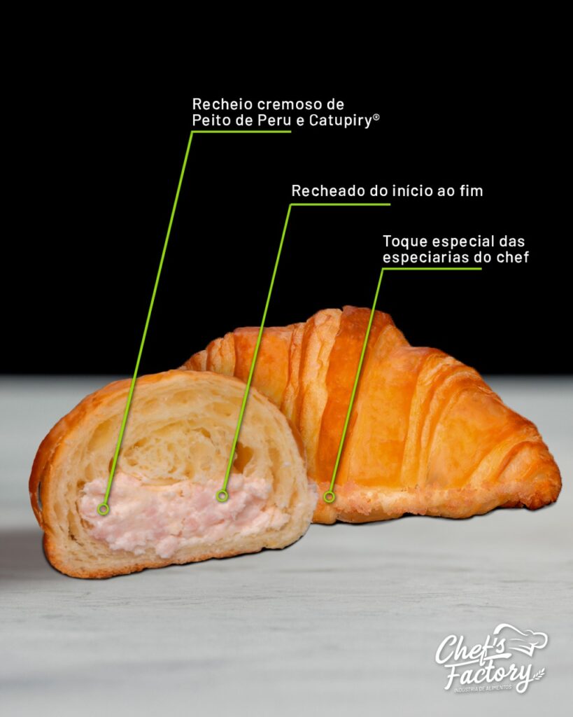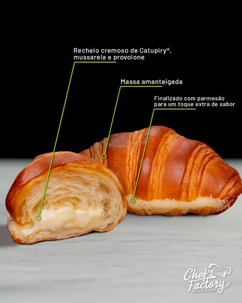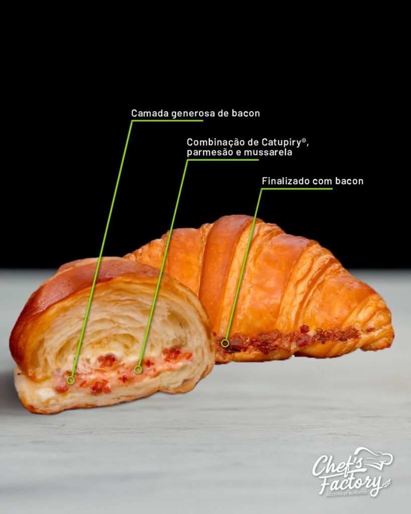 Recheio cremoso leva bacon com uma excelente combinação de queijos: Catupiry®, parmesão e mussarela. As camadas de recheio são generosas, afinal, nossos croissants são recheados depois de assados, garantindo um recheio uniforme.