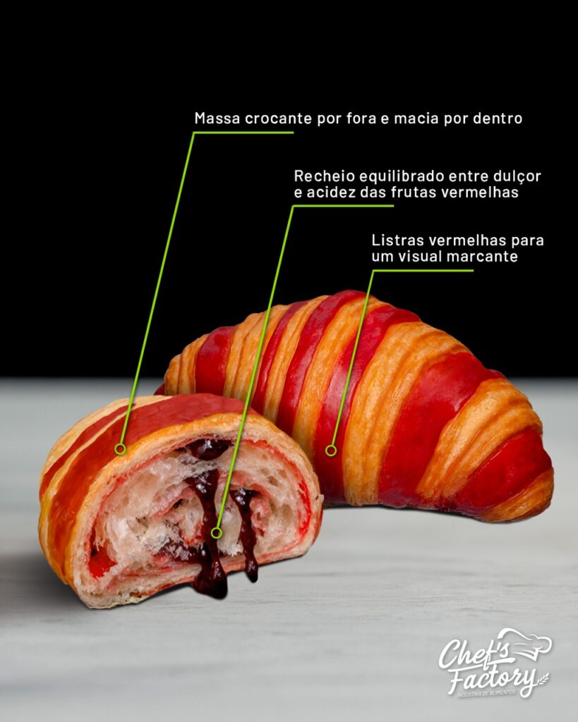 Massa leve e amanteigada, recheada com um creme de frutas vermelhas que equilibra perfeitamente dulçor e acidez. As listras vermelhas realçam o visual e garantem destaque na vitrine, atraindo olhares antes mesmo da primeira mordida.