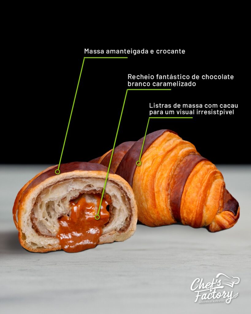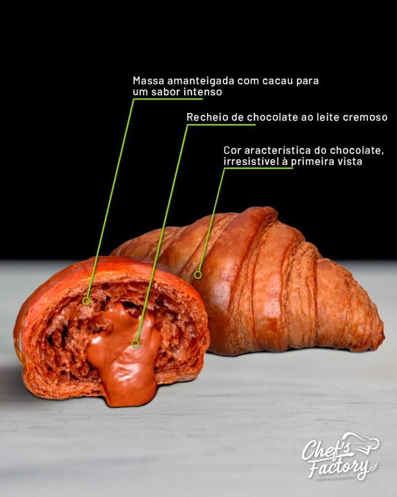 Uma casquinha dourada e crocante que revela um interior surpreendentemente leve e macio. Com alvéolos uniformes e um toque delicado de manteiga, este croissant é a base perfeita para sua criatividade, seja em versões doces ou salgadas.