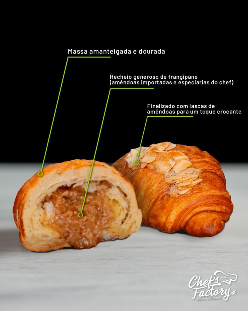 Massa amanteigada e dourada, recheada com um frangipane generoso, feito com amêndoas importadas trituradas e um toque especial de especiarias do chef. No topo, lascas de amêndoas adicionam crocância e deixam a aparência ainda mais irresistível.