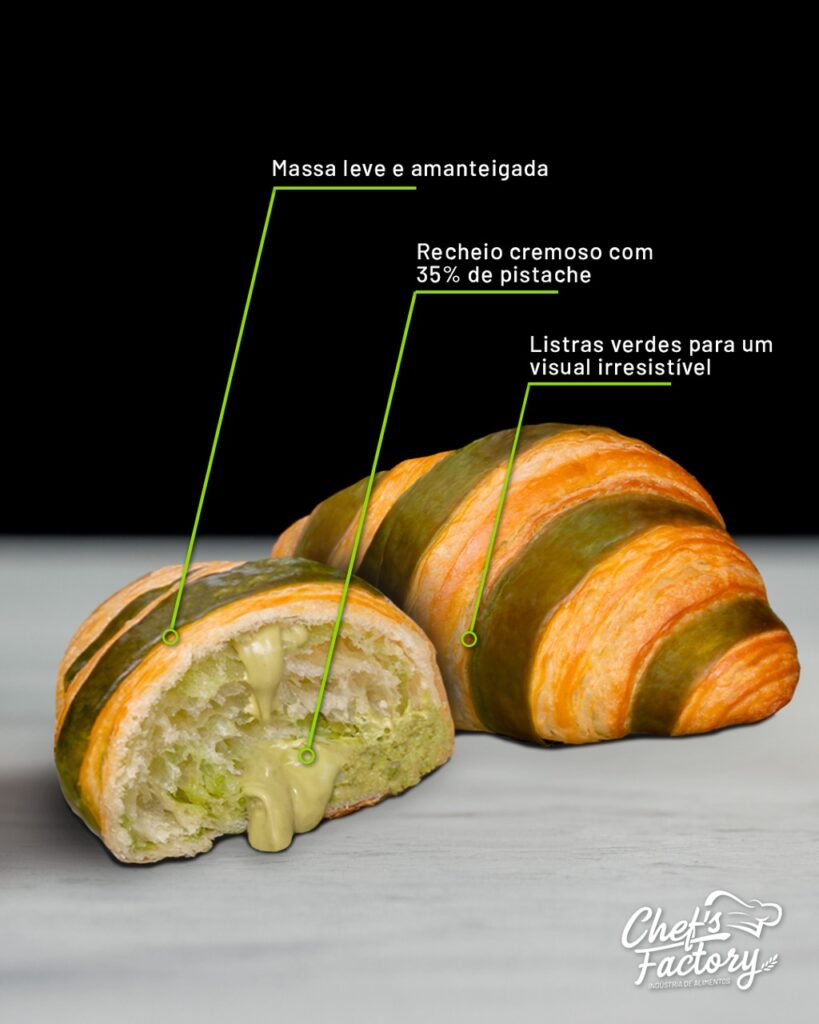 Massa dourada e folhada, recheada com um creme sedoso feito com 35% de pistache. Um receita intensa, autêntica e simplesmente viciante. Para um visual ainda mais chamativo, listras verdes na cor do pistache garantem que ele se destaque na vitrine antes mesmo de conquistar pelo sabor.