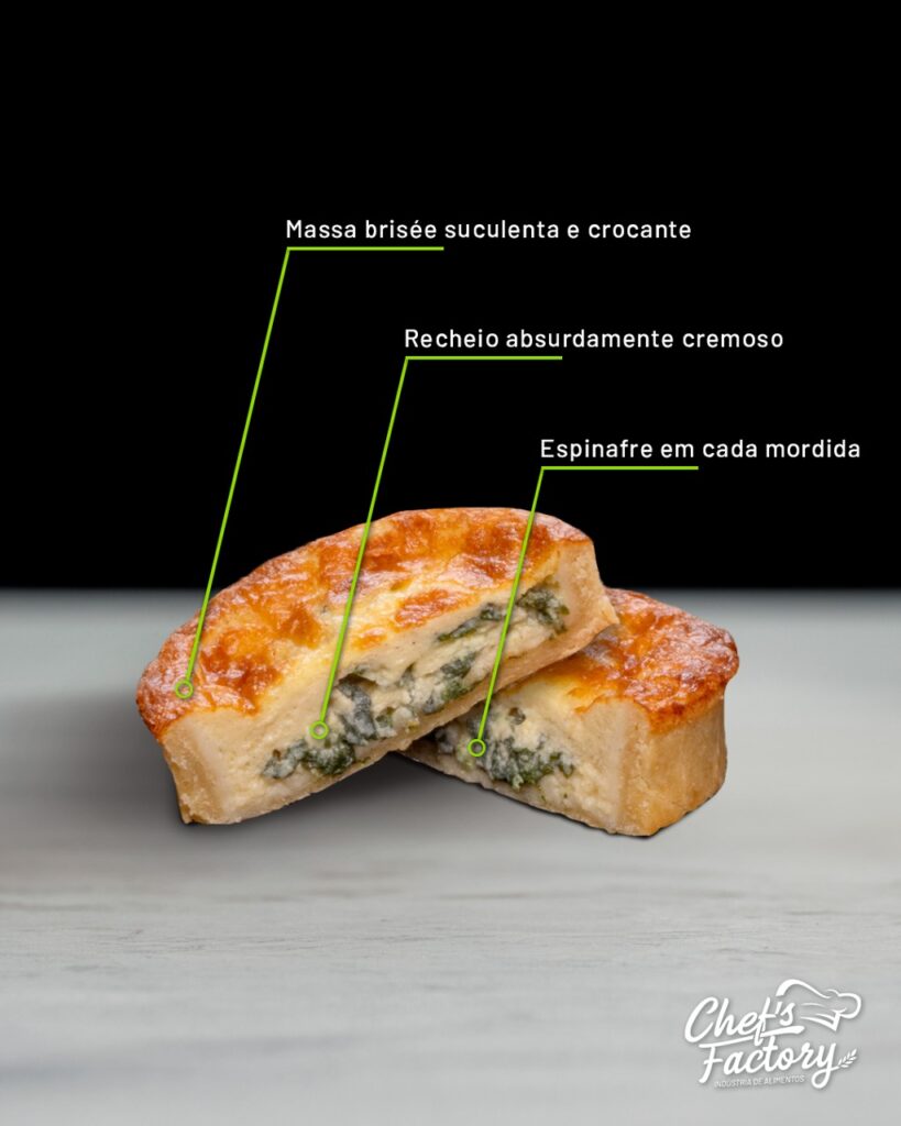 Recheio incrivelmente cremoso, com espinafre presente em cada mordida e um toque de noz-moscada para realçar o sabor. A base? Uma massa brisée suculenta e delicadamente crocante. Uma opção perfeita para vegetarianos e ideal para acompanhar saladas ou transformar qualquer momento em uma refeição completa.
