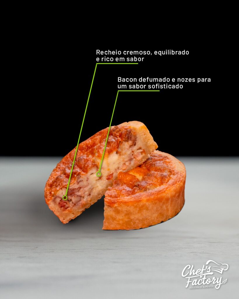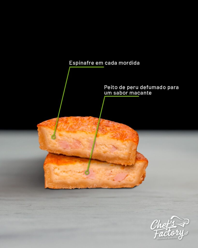 Recheio generoso e cremoso, com pedaços de peito de peru defumado que trazem um sabor marcante. Tudo isso envolto em uma massa brisée delicadamente crocante.