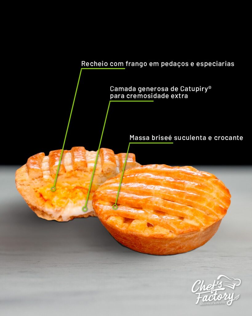 Recheio suculento, temperado com especiarias e frango em pedaços, garantindo textura e sabor. O toque especial? Uma camada generosa de Catupiry® que traz cremosidade. Tudo isso envolto em uma massa brisée leve e delicadamente crocante, diferente das empadas tradicionais.