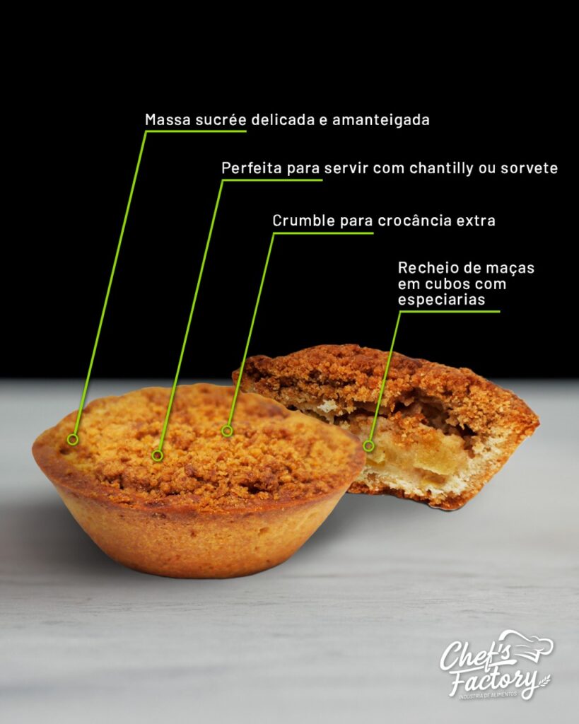 Maçãs em cubos que garantem textura, envoltas no encontro perfeito de baunilha, noz-moscada e canela. A cobertura de crumble traz crocância, enquanto a massa sucrée derrete na boca. Para uma experiência ainda mais especial, sirva com chantilly ou sorvete.